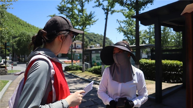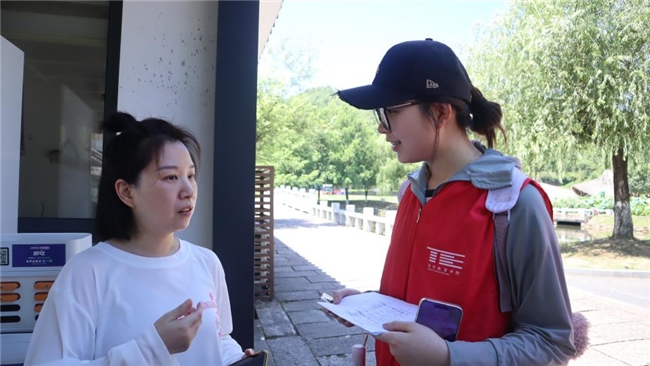 在走访过程中,团队与几名游客展开交流。游客们表示,自己主要是被余村的自然风光和旅游氛围所吸引,但对于余村由矿坑转型发展而来的历史并不了解。这一发现让成员们意识到,在生态转型成果显著的同时,加强余村转型故事的传播、深化游客对“两山”理念认知的重要性。