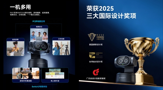 EMEET PIXY的设计卓越性获得了业界广泛认可,包揽了2025年美国缪斯设计大奖金奖、台湾金点设计奖及2025年广交会设计创新奖银奖三项大奖,彰显了产品在设计美学与功能创新上的双重实力。