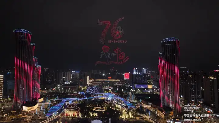 作为万象宜宾天地国庆系列活动的重要亮点,每晚上演的千架无人机表演成为人气制高点。10月1日晚,以夜幕为幕布,无人机编队相继呈现出"粉色江豚"国际IP造型、“长江首城队”川超热点及"76周年庆我爱你中国"等国庆主题图案,在高铁南片区夜空构筑起流动的科技艺术画廊。