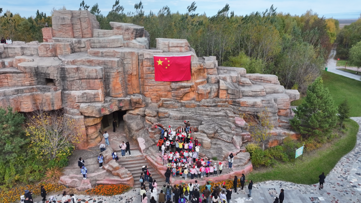 10月1日上午,嘉荫恐龙国家地质公园内,一场特殊的升旗仪式庄严举行。一面定制巨幅国旗迎风铺展,鲜艳的红色象征热血与激情,五颗金星闪耀着团结奋进的光芒,近千名游客自发举起手中的小国旗,齐声合唱《义勇军进行曲》,无指挥、无伴奏,歌声铿锵,情动山河。游客与民警庄重行礼,心怀敬意,仿佛穿越时空缅怀先烈,致敬祖国。