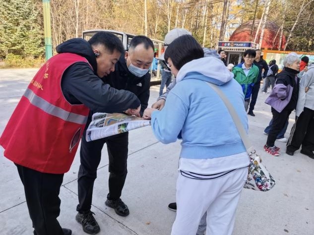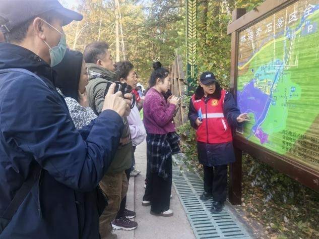 “十一”期间,志愿者们重点覆盖景区内、景区入口、主干道、停车场等游客集中区域,分工协作提供全链条服务。志愿者化身“旅游向导”开展路线指引服务;凭借“人熟地熟”优势精准分流人群,有效防范拥堵风险;主动宣传文明旅游与绿色环保理念;针对“一老一小”等群体,志愿者主动开辟绿色通道,协助行动不便游客上下观光车,为等待接驳车的游客发放当地特色蓝莓干,蔓越莓干等,用细节传递温情。