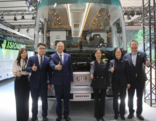 金龙汽车集团董事长陈锋(左三)等集团领导莅临发布会并在海格新V系客车前合影