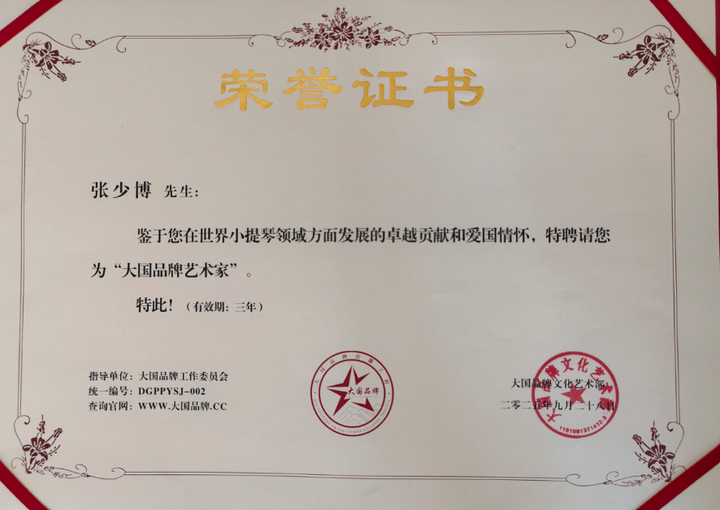 活动的最高潮,大国品牌组委会主任登台,郑重向张少博颁发“大国品牌艺术家”聘书。主任在致辞中表示:“张少博先生用世界性的音乐语言,承载最深厚的中国文化内核,他手中的五弦小提琴,不仅是乐器,更是一件‘大国品牌’。他今晚在祈年殿前的表演,向世界展示了何谓‘中国的,更是世界的’。”