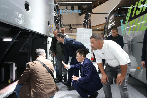 来自阿尔及利亚的嘉宾俯身查看车辆行李舱布局,询问行李舱容积。当得知出口冰岛的新V系车型首次在12米纯电客车上突破10m³的超大行李舱空间后,阿尔及利亚嘉宾由衷地为苏州金龙点赞。