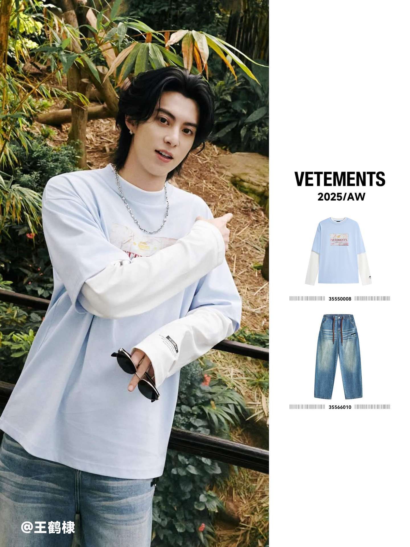 英国潮牌VETEMENTS一直以”IS NOT THE SAME就是不一样”的设计理念著称,鼓励穿着者打破常规、追求个性与自由。王鹤棣本身所具备的阳光、开朗且充满少年感的气质,以及他在时尚领域敢于尝试、勇于展现自我风格的态度,都与 VETEMENTS的品牌精神高度契合。也正因如此,他能轻松驾驭VETEMENTS各类单品,将品牌传递的潮流态度与自身少年气完美融合,展现出令人过目难忘的时尚消化力。