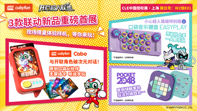 据悉开心超人全网话题阅读量超百亿,品牌知名度名列前茅,其商业价值亦广受行业认可,目前已与卡游、得力文具、森罗万象、英创潮玩、蚯比科技、达利童珍糖玩等等多家品牌达成跨界合作,授权版图覆盖文具、家居、食品、图书等多个领域。游戏联动包括不朽大陆、天天酷跑、元梦之星等等品牌,玩家纷纷评价“梦幻联动,童年经典”。本次展会上,开心超人联盟与AI Fun-Tech科技品牌蚯比科技(Cubyfun) 携三款新品首次亮相,包括联名款AI Cabo插卡对话机、网红爆款潮玩乐器口袋音乐键盘以及风靡海外的2048口袋烧脑掌机,创新玩法引发现场观众热议不断。Cubyfun核心成员来自全球头部无人机和机器人公司,擅长打造激发创造力的娱乐型科技产品,本次正是Cubyfun“科技+娱乐”战略的初现,旨在为全年龄段用户带来有爱、有温度、有创造力的互动体验,让科技不仅是工具,更是陪伴成长的娱乐型伙伴。