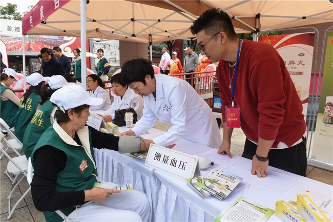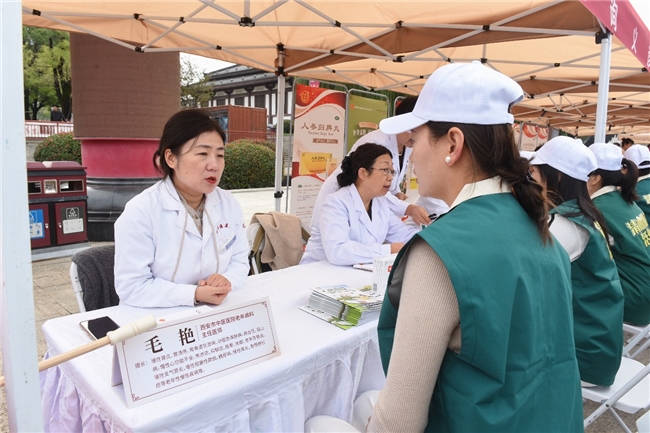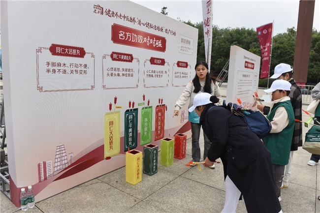 终点区域同样精彩纷呈,健康投壶、知识转盘、主题拍照板等互动游戏将中医康养知识融入趣味体验,寓教于乐,深化健康理念;西安市中医院专家团队提供一对一专业咨询,让大家带着问题而来,怀揣安心而归。此外,参与者还有机会领取中医康养关爱包等精美礼品。北京同仁堂也再度发挥专业所长,其志愿者熟练地为中老年朋友们测量血压,针对不同情况给出科学的生活建议;在用药指导处,志愿者们耐心询问咨询者症状特点,用通俗易懂的语言为其提供清晰的用药指导和个体化建议。这一系列扎实的公益举措,生动诠释着百年老字号扎根社会、服务民生的诚挚初心,赢得现场市民的一致好评。