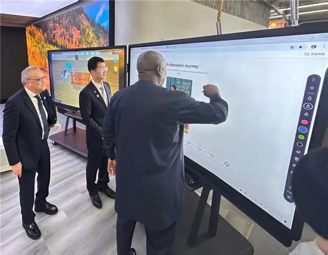 在网龙长乐基地,马哈马总统一行首先听取了网龙在全球取得的一系列国家级合作案例的报告,并详细了解了网龙AI课件、AI生产中心等产品和技术能力。网龙还根据马哈马总统的回忆录,利用AI能力设计并制作了一个互动课程,通过网龙普罗米休斯互动显示屏展示了马哈马总统与其父亲关于教育的理解和评价。马哈马总统体验之后表示非常喜欢,并使用该互动显示屏的标注功能做了签名。