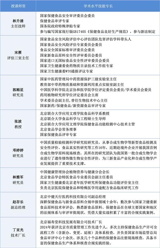 邀请国家市场监管总局食品审评中心、国家卫健委和国家食品安全风险评估中心国内一线保健食品、新食品原料权威评审专家,面对面集中授课,提供权威指导,理论+技能+方法+经验+实操,全方位解疑释惑。
