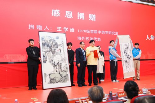 10月18日,北京中医药大学“2025年校友秩年返校大会暨建校70周年纪念活动倒计时一周年启动仪式”隆重举行。作为该校1978级首届中药学研究生、旅美杰出校友的代表,王学治先生将两幅亲自创作的国画作品《盛世风韵》与《中流砥柱》,郑重捐赠予母校。随后,他与校党委书记王瑶琪、校长唐志书等校领导及师生代表一同,推动了象征着新征程开启的倒计时推杆。金沙倾泻,华章新启,中医药事业的精神血脉薪火相传、历久弥新。