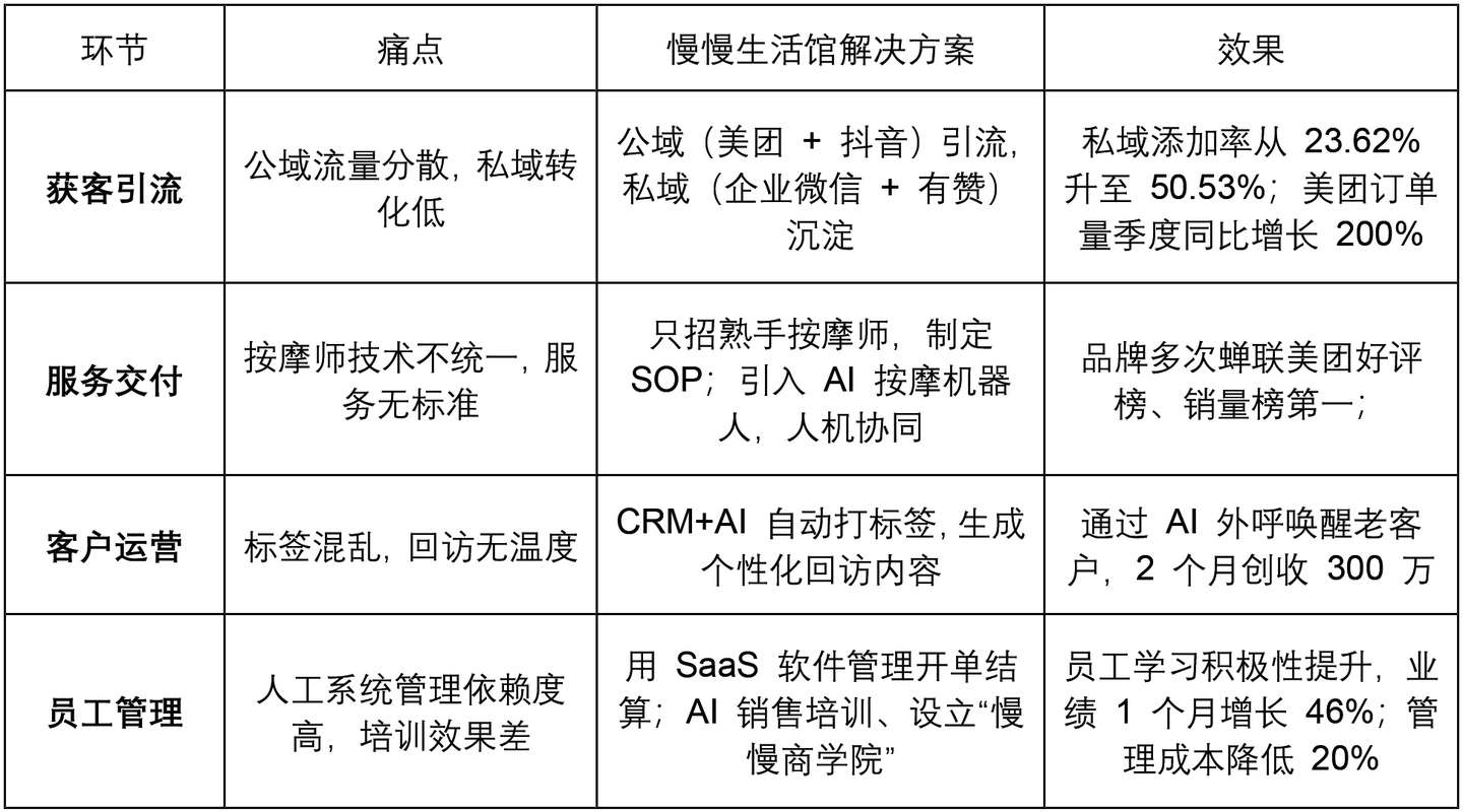 传统大健康服务连锁的最大难题是 “店长统筹效率低、数据不互通”,慢慢生活馆通过 SaaS 软件为店长减负:开单、结算、排班等基础工作可在系统上快速完成,门店运营无需陷入琐事,能专注于服务监督与顾客沟通;同时,AI 工具在招聘、培训、巡店等环节发力 ——例如1 个 HR+AI 每月能收 3000 封简历、快速补充人才;在培训端,推出 “AI 成交教练”,每天提供 3 个真实销售场景,员工语音答题后 AI 自动评分、排名,1 个月内业绩提升 46%...