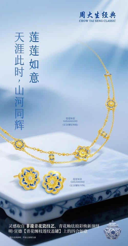 青花晕染,恰似岁月在时光画卷上细腻的勾勒。那柔和的笔触,在白瓷素胚上静静绽放,宛如深藏于时光尽头的一场清梦,温柔而悠远。岁月流转,那些动人的瞬间如同青花纹样,在记忆深处悄然延展定格,晕染出生命最本真的色彩。东方非遗文创珠宝品牌周大生经典,以非遗青花瓷技艺为灵感,将千年瓷韵凝练于东方·青花系列产品之中。青花的雅致纹样被巧妙融入黄金华彩,既承袭了传统工笔的婉约意境,又赋予了现代设计的灵动风骨,续写青花那永不褪色的浪漫诗篇。