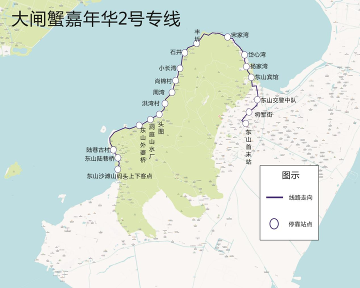 停靠站点:东山沙滩山码头上下客点、东山陆巷桥、陆巷古村、东山外婆桥、洞庭山水厂、头图、洪湾村、周湾、尚锦村、小长湾、石井、丰圻、宋家湾、岱心湾、杨家湾、东山宾馆、东山交警中队、将军街、东山首末站