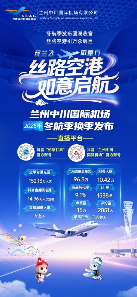 回顾直播,兰州机场通过对冬航季新开航线和服务品牌的全面介绍,以及对航班次卡、航旅套票、文创产品的精准营销,实现了“航文旅”融合发展的全新赋能。两场直播总曝光量近300万次,累计观看人数达25万,点赞30余万次,涨粉2700人,商品转化率高达9.1%。