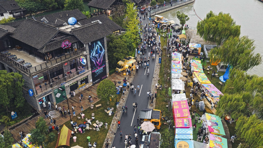 本届戏剧集市完成了从北栅至西栅运河沿岸的场域焕新,一跃成为人声鼎沸的聚会现场。随处可见的嘉年华表演、星罗棋布的美食小摊、夜晚躁动的音乐空间,让乌镇的人间烟火气在此具象化,成为年轻人聚集的能量场。从白天到黑夜,大运河畔人潮如织,欢声不绝。