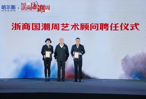 在活动现场,吴海燕和毛戈平受聘为“浙商国潮周艺术顾问”,由周国辉颁发聘书。