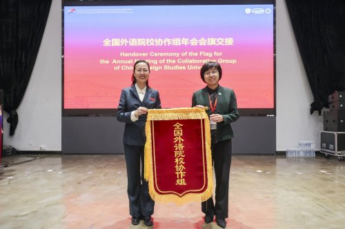 张环宙向天津外国语大学交接全国外语院校协作组会旗。周红蕾代表第40届年会承办院校发言。