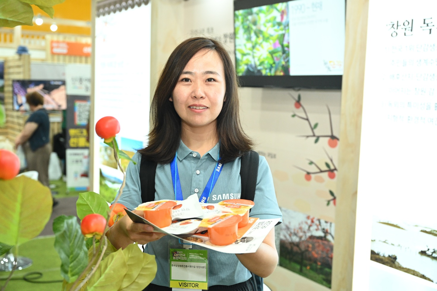 “村带头人访韩”活动期间,杨维娜参观农博会柿子深加工产品