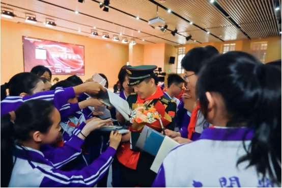 (二)学生谈:让爱国薪火接续传递。每场宣讲结束后,礼堂里没有一丝散场的迹象。师生们总会簇拥着报告人交流互动、合影签名,孩子们攥着笔记本,像追着光一样围拢在英雄身边,久久不愿离去。有孩子流着泪诉说梦想——将来要考军校,走出大山、报效祖国;有人递上手写卡片:“我以前不懂什么是爱国,现在懂了,那就是有人替我们扛起了山河”;“要像英雄爷爷一样保卫祖国”的稚嫩誓言一遍遍响彻礼堂。