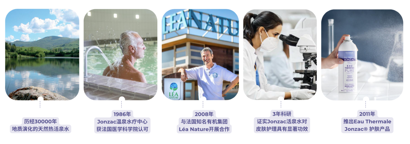 2008年,法国知名有机集团Léa Nature(中文名:莱亚自然)将这股源于Jonzac小镇的天然活泉疗愈能量引入护肤领域,经过三年科学研究证实Jonzac活泉水对皮肤护理具有显著功效,并2011年正式推出首个以“Eau Thermale Jonzac”命名的护肤系列,自此开启了针对敏感肌的医研级天然活泉护肤新纪元。