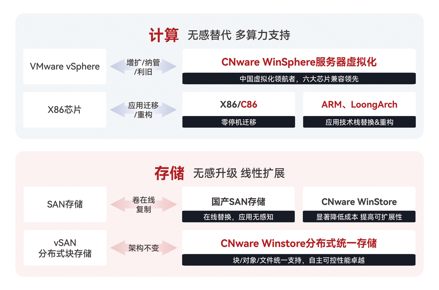 对于已部署VMware全栈SDDC的大型企业,云宏CNware提供渐进式替代方案。该方案延续VMware模块化设计理念,通过统一管理平台实现整体运维,使现有运维团队能够无缝衔接。在性能层面,CNware不仅在全闪存存储场景下提供更强的IO性能,一云多芯与软硬件解耦特性还支持更广泛的异构云平台纳管,具备更开放的生态扩展性。同时,方案完整支持x86与国产化芯片的混合部署,为企业构建安全可控的云基础设施奠定基础。