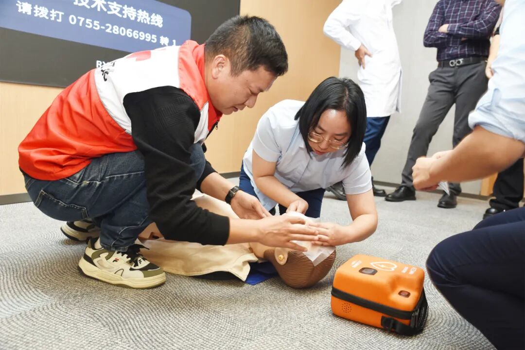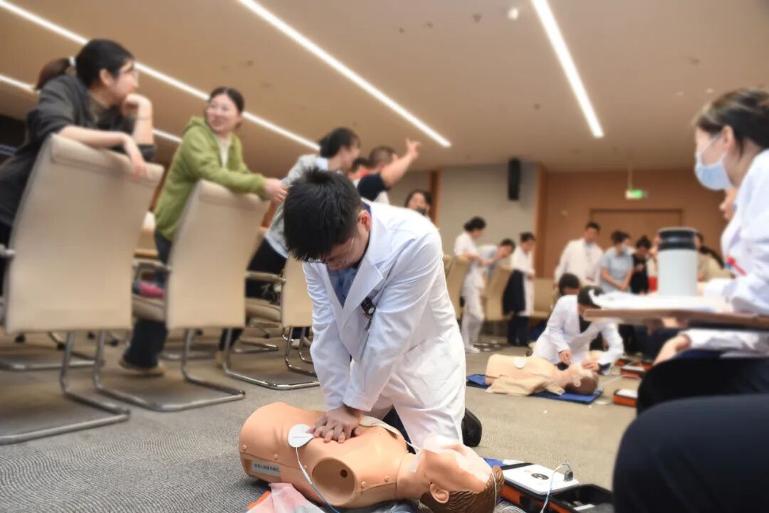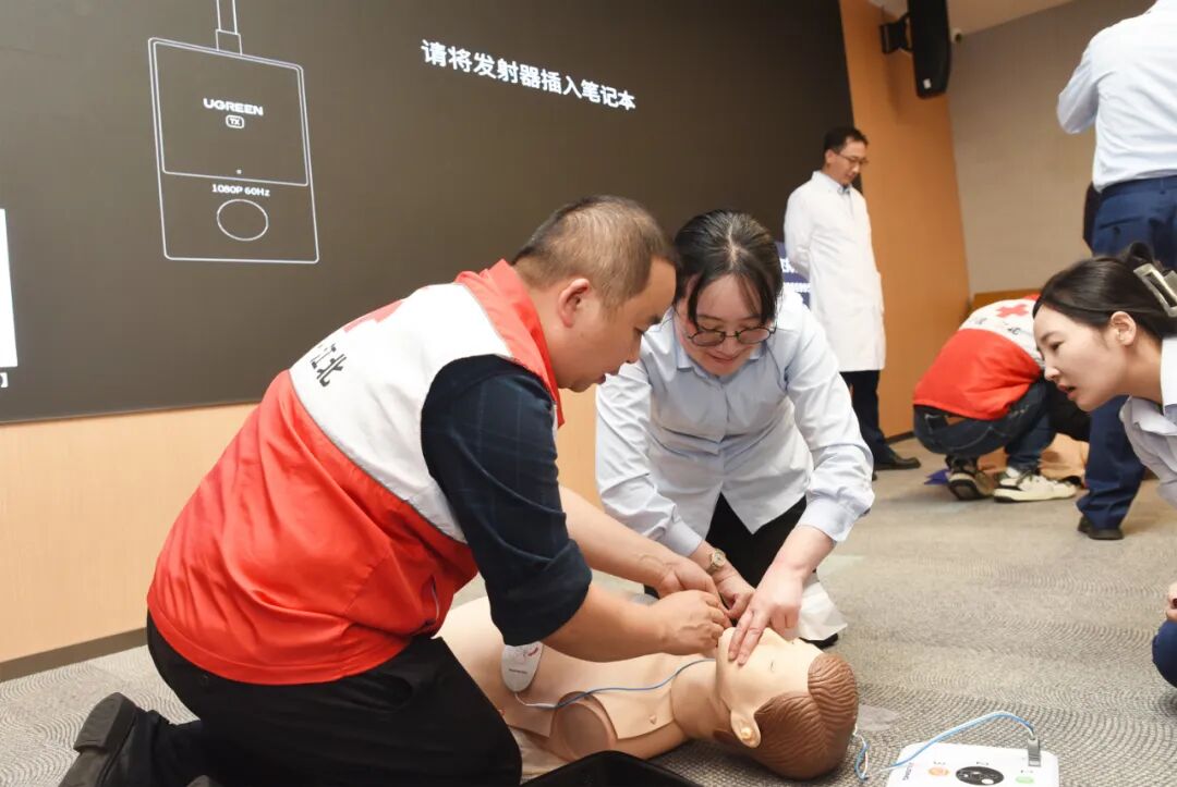 理论学习结束后,现场随即进入实操与考核环节。医务人员分组进行心肺复苏与AED使用的模拟演练,讲师逐一指导并纠正动作要领,确保每位学员都能熟练掌握“判断—呼救—按压—除颤”完整救护流程。
