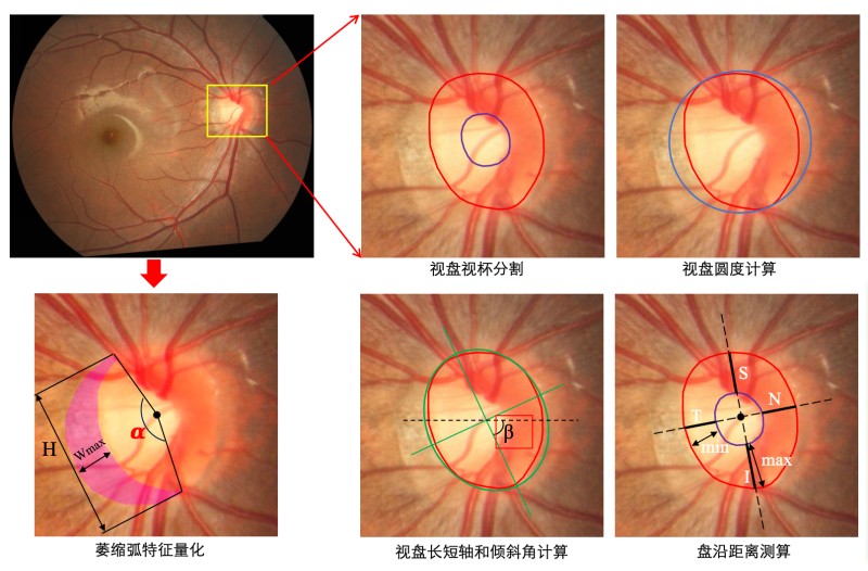 图:EVisionAI对视盘、萎缩弧等进行测量计算示意图