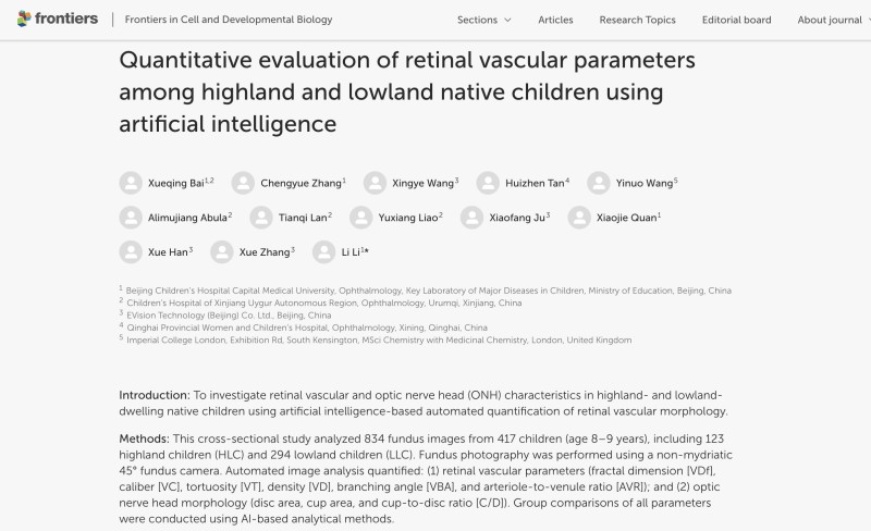 近日,首都医科大学附属北京儿童医院李莉教授团队联合依未科技,在国际知名期刊《Frontiers in Cell and Developmental Biology》(DOI: 10.3389/fcell.2025.1693739)发表重要原创研究成果。该研究首次通过AI驱动的全自动化眼底定量技术,系统剖析高海拔与低海拔地区原住民儿童的视网膜血管及视乳头的形态特征,为慢性低氧环境对儿童眼部微血管发育的影响提供了全新科学证据,更以精准量化的研究范式彰显了眼底表观影像学参数作为Biomarker(生物学标志物)在小儿眼科临床科研中的突破性价值。