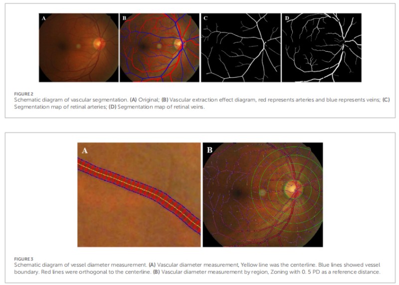 视网膜血管定量参数:涵盖反映血管复杂程度的分形维数(VDf)、体现血管粗细的管径(VC)、表征血管形态的弯曲度(VT)、反映血管分布密度的密度(VD)、显示分支特征的分支角(VBA),以及评估血管比例的动静脉比(AVR),这些参数共同构成了视网膜微血管功能的 “数字画像”;
