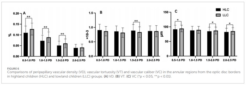图:高原儿童(HLC)和低海拔儿童(LLC)组中,距视盘边界不同环形区域的视盘周围血管密度(VD)、血管弯曲度(VT)和血管管径(VC)的比较