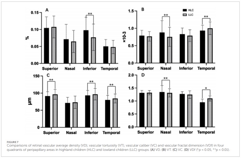 经协方差分析校正年龄、性别、眼轴长度等混杂因素后,研究揭示了多项具有统计学意义的关键发现:高海拔儿童组的视网膜血管管径(VC,77.865μm vs. 81.663μm,p=0.005)与血管分支角(VBA,62.161° vs. 63.611°,p=0.003)显著小于低海拔组,提示慢性低氧可能导致血管收缩与分支模式改变;而视盘面积(2.549mm² vs. 2.365mm²,p<0.001)与视杯面积(0.625mm² vs. 0.557mm²,p<0.001)显著更大,反映出视神经乳头对低氧环境的适应性形态调整。更具临床价值的是区域分布差异:高海拔儿童盘周下方象限血管密度更高(0.098% vs. 0.077%,p<0.001)、鼻侧与颞侧象限血管弯曲度更高(均 p<0.001),且鼻侧象限血管分形维数更低(p=0.001),这些局部量化特征为解析低氧对眼底的区域特异性影响提供了精准靶点,为早期干预提供了明确方向。