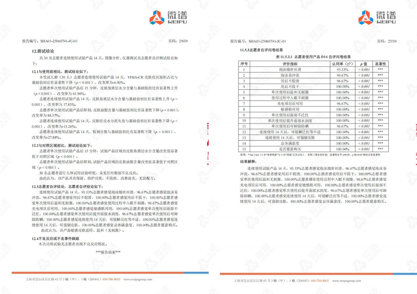 hfp出具的第三方检测报告中可以看到,33名敏感肌受试者单次使用后,面部油光减少88.57%,角质层水分增加61.96%,连续使用14天后,经皮失水减少13.26%,数量减少27.88%,即屏障更强韧、肤质更健康!