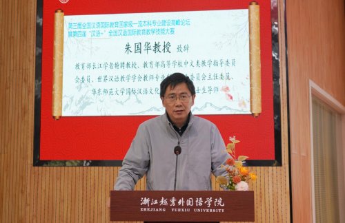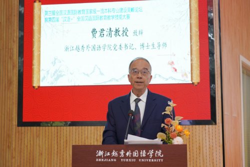费君清教授在致辞中向出席论坛的各位专家学者及师生表示热烈欢迎,并简要介绍了绍兴的地域文化特色与学校办学概况。他表示,希望通过本次高峰论坛和教学技能大赛,与全国兄弟高校深入交流汉语国际教育人才培养的创新实践,分享我校“汉语+”教学改革成果,促进各校学生之间的专业互动与能力提升。同时,学校也将积极借鉴各高校的有效经验,取长补短,持续推动汉语国际教育国家级一流专业建设和“汉语+”人才培养模式改革走向深入。