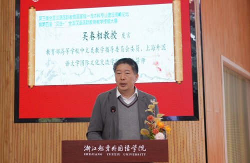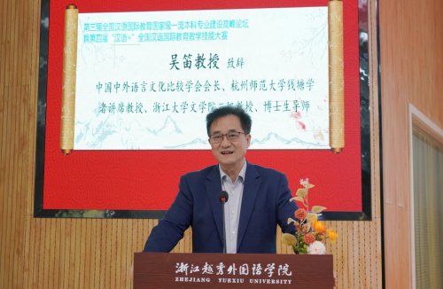 吴笛教授在致辞中对本次论坛和大赛的顺利召开表示热烈祝贺。他指出,中外语言文化比较学会与浙江越秀外国语学院联合举办的“汉语+”专业建设高峰论坛和教学技能大赛,在推动汉语国际教育专业建设、促进师生专业能力提升方面持续发挥积极作用。他强调,要坚持以赛促学、以赛促教,通过技能大赛提升师生综合素质,检验人才培养成效,并希望与会专家围绕汉语国际教育发展、国家级一流专业建设等议题深入交流,为服务国家战略和文明互鉴贡献智慧。最后,他预祝参赛选手赛出水平、赛出风采,并祝愿大会圆满成功。