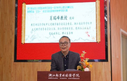 肖瑞峰教授在致辞中代表浙江省中文教指委致辞。他对本届论坛和大赛的顺利举办表示热烈祝贺。他回顾了以往四届论坛和赛事取得的成果,高度评价这两项活动重要意义,不仅为各高校提供了交流互鉴的重要平台,而且有效促进了学生实践能力和专业素养的提升。他强调,面对AI技术赋能等新机遇,本次聚焦“汉语国际教育国家级一流专业建设”具有重要的现实意义,有助于推动教学模式创新与人才培养质量提升。他充分肯定浙江越秀外国语学院中文学院持续举办高水平学术活动,保持了专业发展的强劲势头,并希望参赛选手赛出风采、收获成长。他预祝两项活动圆满成功。