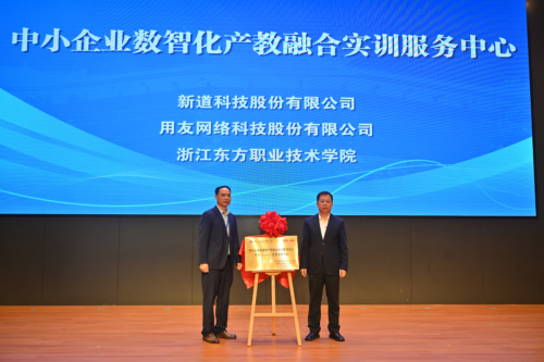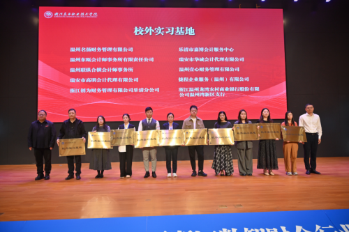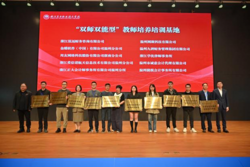 王佑镁分别与用友浙南分公司总经理黄东荣、中联集团浙江分公司总经理朱文明分别为“中小企业数智化产教融合实训服务中心”和“业财税数字化云服务中心”揭牌。学校党委委员、纪委书记郑铁豪与龙湾区工商业联合会党组书记孔繁义共同为10家企业授予“双师双能型”教师培养培训基地,郑铁豪与龙湾区委统战部常务副部长林克钦为10家企业授予“校外实习”基地。