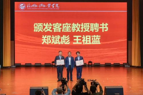 (福州外语外贸学院为郑斌彪、王祖蓝颁发客座教授聘书)