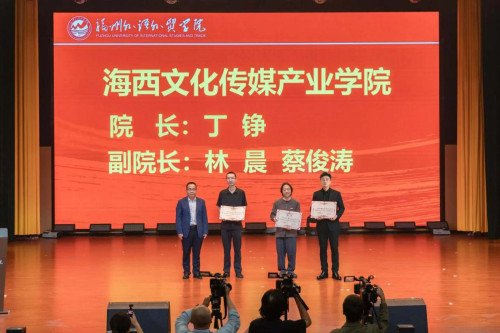 (福州外语外贸学院为海西文化传媒产业学院院长丁铮,副院长林晨、蔡俊涛颁发聘书)
