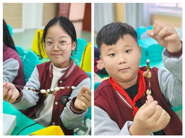 在课堂最后的成品分享环节,温情氛围推向高潮。孩子们手捧着亲手制作的种子项链,争相诉说着作品背后的心意:有的孩子眼神真挚,想要将这份凝聚创意与温度的礼物送给奶奶,以感谢日常的悉心照料;有的孩子满含期许,希望把项链赠予姐姐,祝愿她能挣脱束缚、随心所欲拥抱生活;还有的孩子选择将这份特殊的“星光信物”留给自己,作为记录成长、鼓励自我的珍贵纪念。