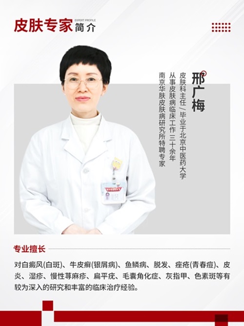 邢广梅主任毕业于北京中医药大学,从事皮肤病临床工作三十余年,是皮肤科的资深专家。她对白癜风、牛皮癣、鱼鳞病等皮肤病有着较为深入的研究和丰富的临床治疗经验。对于痤疮、皮炎、湿疹、慢性荨麻疹等常见皮肤病,邢主任也能根据患者的具体情况,制定个性化的治疗方案。她充分发挥中医药的优势,运用中药内服、外用等方法,调理患者的身体机能,从根本上治疗皮肤病,为患者带来了新的治疗选择。