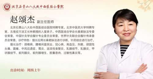 赵颂杰,副主任医师,北京石景山八大处中西医结合医院特聘专家,出诊时间周四上午。北京中医药大学特聘专家、古易经方派王长林教授的入室弟子。中西医结合学会长桑君脉法专委会常委,中国针灸学会腹针专业委员会常委,世界针灸联合会腹针传承委员会常委,诊疗特色:擅长应用长桑君脉法进行诊断,针药结合进行治疗。擅长治疗:颈椎病、腰椎间盘突出、冠心病、高血压、失眠、顽固性头痛、面瘫、中风后遗症、胃炎、返流性食管炎、乳腺结节、乳腺炎、甲状腺结节、前列腺炎、前列腺增生、胆囊息肉、过敏性鼻炎等。