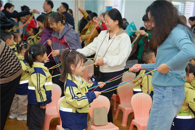 重庆市江北区中亿新村幼儿园的活动打造“动漫+童声”沉浸课堂,孩子们在《亲亲拉进舞》等互动游戏中与祖辈亲密协作,套圈、踢毽子等经典游戏更让亲情升温,孝心在欢声笑语中自然流淌。