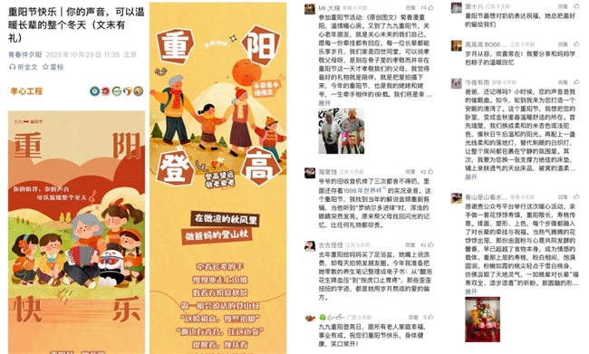 “青春伴夕阳”公众号推出“重阳快乐”话题,汇集各地重阳节祝福,满是浓厚的节日氛围与家庭温情。截至目前,阅读量已突破5000。
