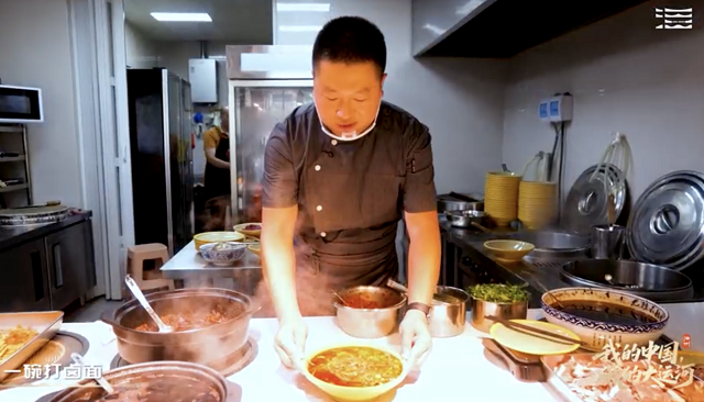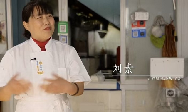 在泗县老字号“大庄鳝丝汤”的拍摄中,刘师傅重现了传说中与隋炀帝“南巡”相关的历史名菜“胜胡长久鳝”(今称鳝丝汤)。镜头下,刘师傅将鲜活黄鳝去骨切丝,入锅翻炒后注入鸡骨高汤,并撒入韭菜叶提鲜。刘师傅‘这道菜古称‘胜胡长久羹’,鳝谐音‘胜’,韭菜象征‘长久’,寓意华夏男儿战胜胡人、国运绵长。如今我们沿用古法,但选用运河水域黄鳝,肉质更紧实,汤底醇厚中带酸辣,既是历史记忆,也是泗县‘不南不北’口味的代表。”