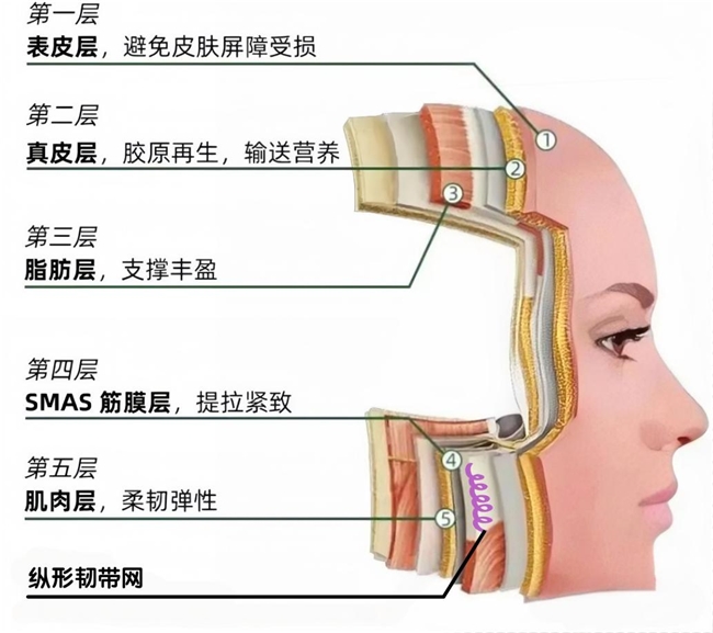 1.因“层”施治:针对不同层次(如:肌肉层、SMAS筋膜层、脂肪层、皮肤层)分别进行精准提紧。