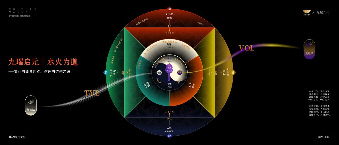 WaveUP 创始人 天枢 在总结发言中指出,无论生态建设还是机制创新,其最终指向都应是文化的延续与精神的共识。他介绍WaveUP 以 “九瑞文化” 作为精神总纲,将东方意象中的“四象守护、三圣引领、双瑞合一、一脉共鸣”融入平台的价值体系与治理理念之中;以文化的秩序承载信任的结构,让精神成为制度的根基。
