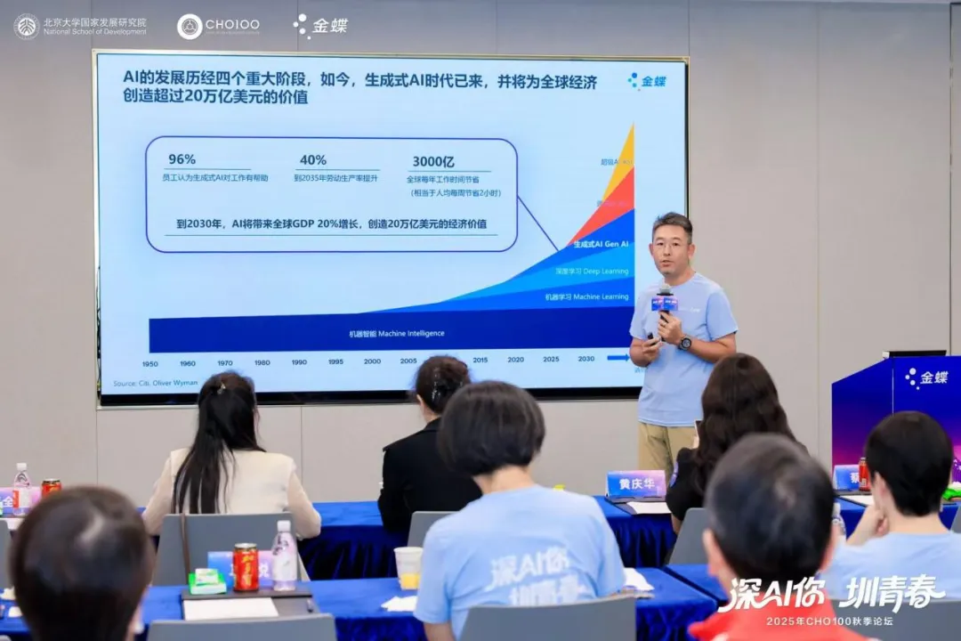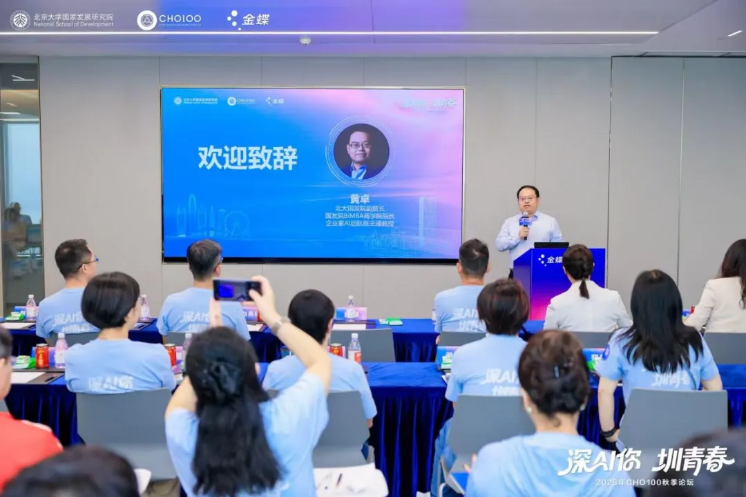 10月31日至11月2日,2025年CHO100秋季论坛在深圳金蝶云大厦成功举办。本次论坛以"深AI你 · 圳青春"为主题,由北京大学国家发展研究院(以下简称“北大国发院”)、CHO100与金蝶共同举办。在为期三天的活动中,来自全国各地企业的近百位CHO及北大国发院校友相聚金蝶,共议人工智能浪潮下的增长机遇与企业变革之道。