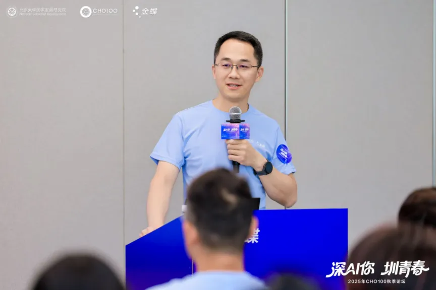 随后,北京大学国家发展研究院副院长、南南合作与发展学院副院长黄卓教授致欢迎辞。他表示:当下,全球地缘政治格局深刻转变,AI 技术革命正以全方位力量渗透各领域,北大国发院也期待能够通过平台搭建,汇聚 CHO 伙伴、同学校友及各界专家共同研讨应对之策。同时,期待与金蝶深化合作,共同推动 CHO 成为 AI 时代科技与人的联结者。