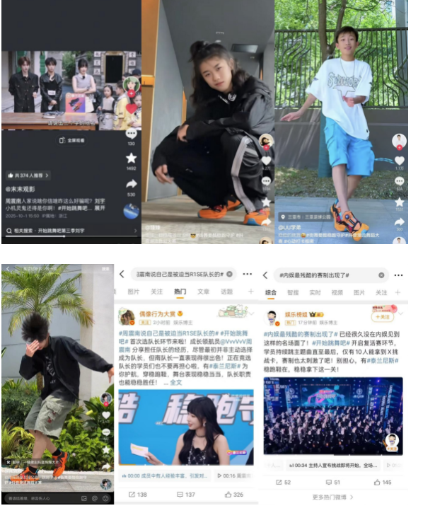节目播出期间,泰兰尼斯品牌官方社交账号围绕节目内容进行精细化运营,释放多条高光“CUT”片段,获得可观点赞量。同时,观众及文娱类KOL自发截取品牌高光时刻进行传播,衍生出大量UGC内容,总预估曝光为5亿,实际完成曝光5.2亿+,挑战赛相关数据指标均已超额完成。臻臻、UU学弟和张轶程等嘉宾也穿着泰兰尼斯稳跑鞋参与抖音舞蹈挑战赛活动,进一步扩大了品牌影响力。