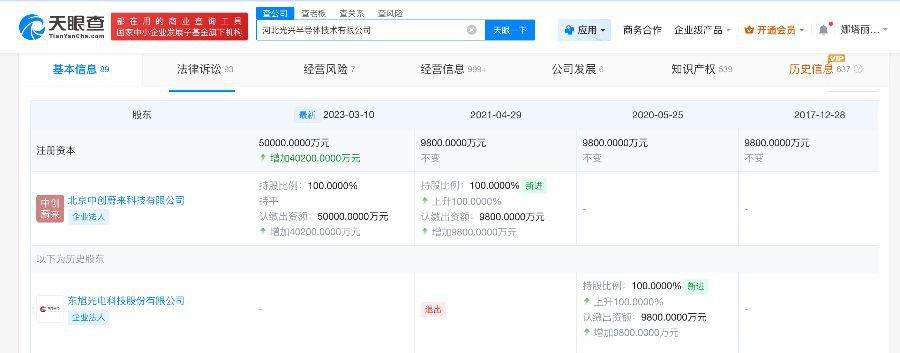 河北光兴半导体技术有限公司(下称 " 河北光兴 ")当前控股股东为北京中创蔚来科技有限公(下称 " 中创蔚来 ")司。河北光兴曾用名为石家庄东旭光电装备技术有限公司,2021 年,作为河北光兴原控股股东的东旭光电退出公司,由中创蔚来新进接手。